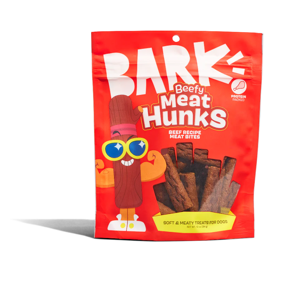 Remember all the fun snack mascots you grew up with? Well, your dog doesn’t! BARK is here to fix that! Beefy Meat Hunks™pack soft & meaty, beef recipe dog treats into a pouch straight out of your childhood. These delicious treats are packed with protein and nutritious grains. We know your dog will love them, because BARK ships millions of treats and toys to subscribers every month! Backed by BARK’s 100% Happiness Guarantee, Beefy Meat Hunks™are Ridiculously Nutritious™!