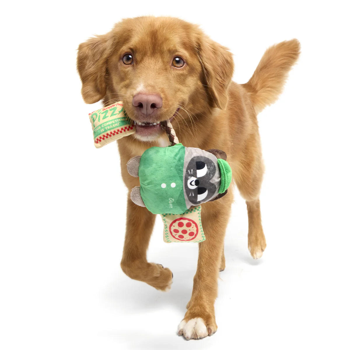 This raccoon pizza-guy dog toy delivers all the fun! Late Bite Delivery Guy's T-shirt rope is perfect for interactive play, and his built-in squeaker and crazy crinkle material will keep your dog entertained for hours. Late Bite Delivery Guy doesn't accept tips, but he does accept tugs! And trash.