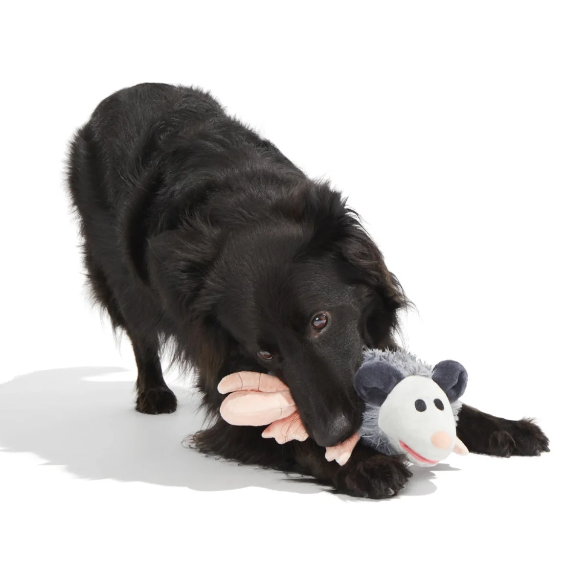 Poppy Possum keeps playtime alive by playing dead—but thrash him enough and he’ll let out a squeak! While he may look creepy, this fluffy, crinkly critter is im-possum-bly fun, featuring shreddable hair, a whip-n-flip tail, and tuggable feet and ears for a variety of playstyles. Trash? More like thrash! All this mar-pup-ial wants to do is play with your pup!